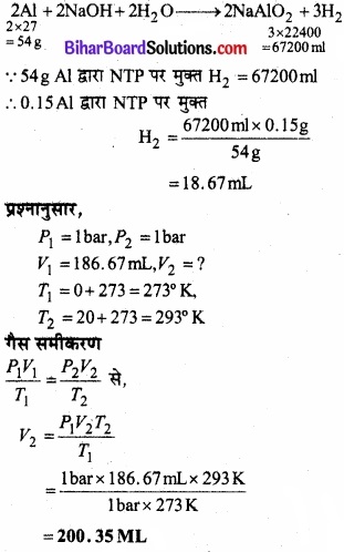 नाली साफ करने वाले ड्रेनेक्स में सूक्ष्म मात्रा में एल्यूमीनियम होता है। यह कॉस्टिक सोडा से क्रिया पर डाइहाड्रोजन गैस देता है। यदि 1 bar तथा 20°C ताप पर 0.15g एल्यूमीनियम अभिक्रिया करेगा तो निर्गमित डाइहाइड्रोजन का आयतन क्या होगा?